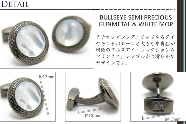 BUSINESS BULLSEYE SEMI PRECIOUS GUNMETAL & WHITE MOP タテオシアンシグニチャであるダイヤモンドパターンと大きな半貴石が特徴のブルズアイ・コレクションカフリンクス。