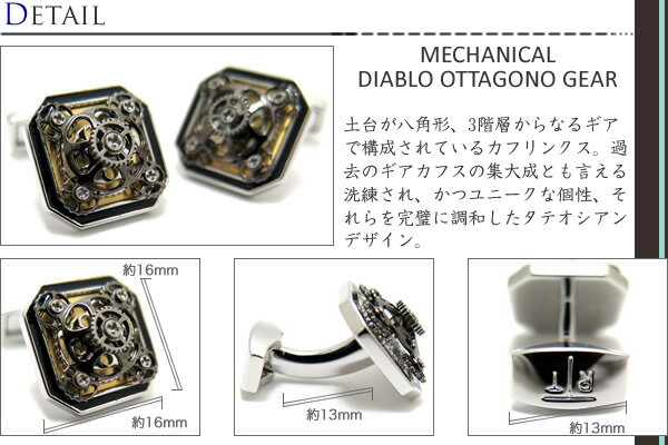 MECHANICAL DIABLO OTTAGONO GEAR RHODIUM & BRUSHED GOLD 土台が八角形、3階層からなるギアで構成されているカフリンクス。