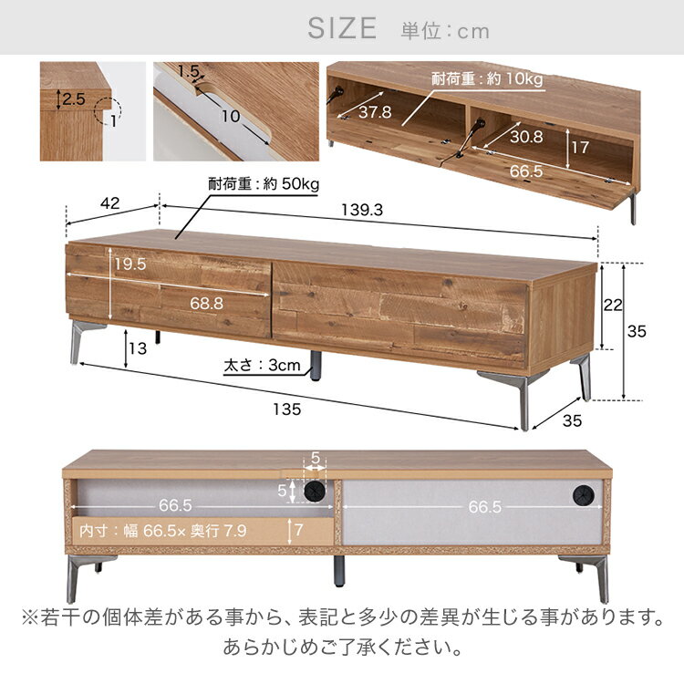 商品のご紹介 サイズ幅139.3x奥行42x高さ35cm 素 材前板:アカシア無垢本体:プリント脚:スチール(中央脚のみ木製でアジャスター付き) カラーシャビーナチュラル 重 量約21kg 耐荷重天板:約50kg扉内:約10kg 梱包サイズ142x44x24cm(約23kg) 生産国日本 備 考※当商品の配送について※お届けまで約1週間前後かかります。